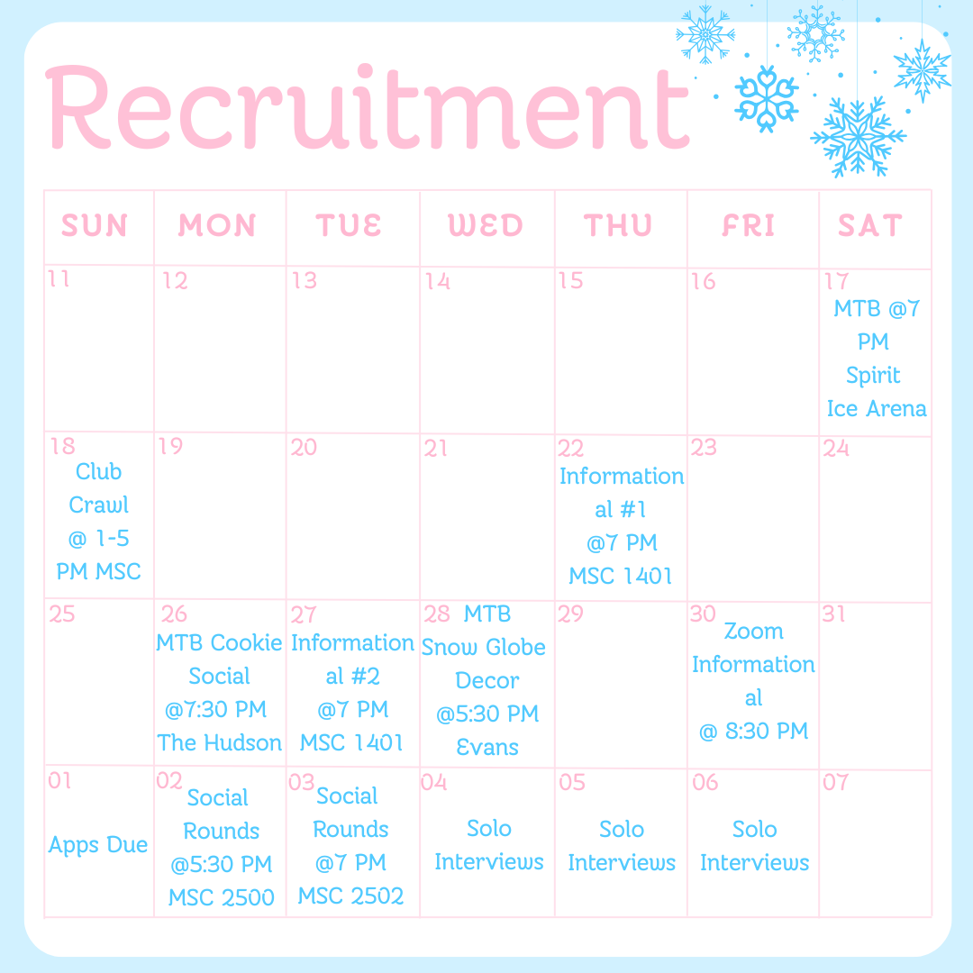 This recruitment calendar includes general information about our events! Make sure to follow our instagram @aggie.babes to get more up to date information as recruitment goes on!